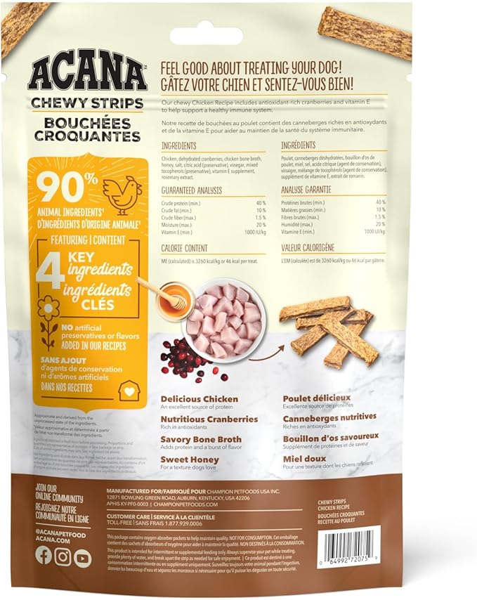 • One (1) 4 oz bag of ACANA Chewy Strips Chicken Dog Treats
