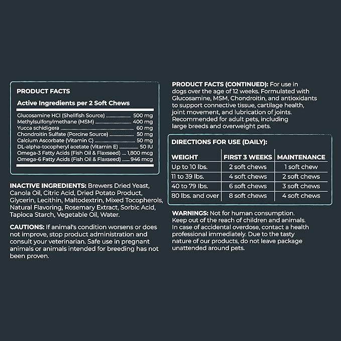 - Mighty Support for Mighty Dogs: Our joint supplement features the dynamic trio of glucosamine, chondroitin, and MSM, working together like a fur-bulous squad to support your pup's joint health and mobility.