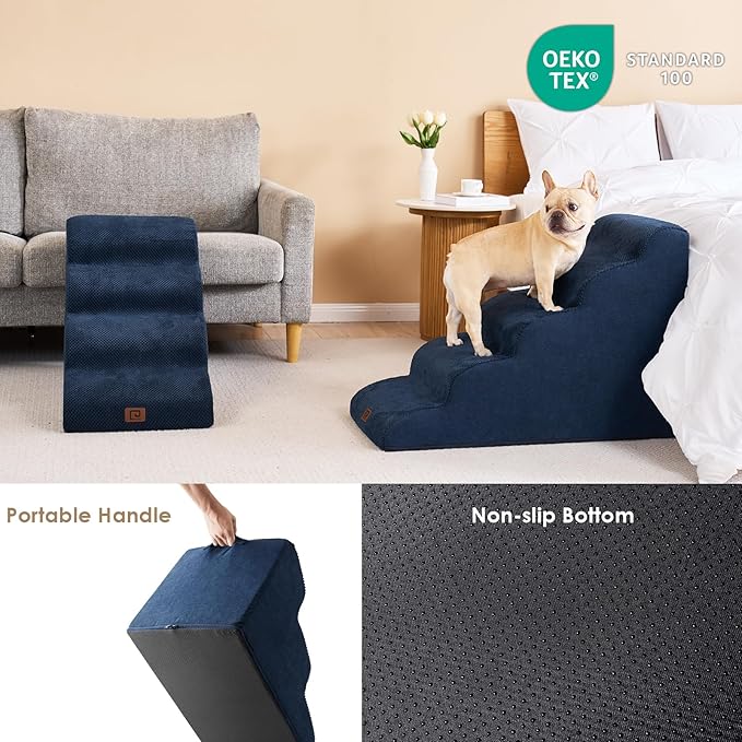 - SPECIFIC AND STEADY DESIGN - 33D density of pure foam make this stair more steady when your pets walk on. The dog bed stairs can provide strong support for pets in the walking process. Low angle slope design can better protect your pet's joints.