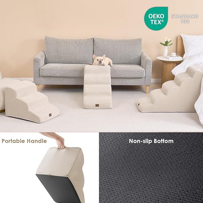 - COMFORTABLE PET STAIRS - This foam dog stair is designed directly against the edge of a bed, sofa or other furniture, so your pet can climb up and down comfortably.