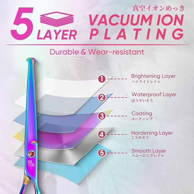 - Stunning & Unique Design: Our straight pet scissors feature a charming colors inspired by nature's rainbow, which add a touch of style and uniqueness to your grooming routine. This high-end Titanium-Nitride Coating, which is different from ordinary paint coatings, is virtually impossible to be scratched or come off.That's why it has an absolute advantage in the market!