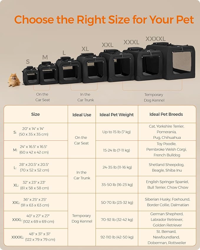 - _HOOSE THE RIGHT SIZE_his 28" x 20.5" x 20.5" collapsible dog carrier is ideal for pets between 24-35 lb. Please read our tips on the pictures to measure your pet and choose the right size