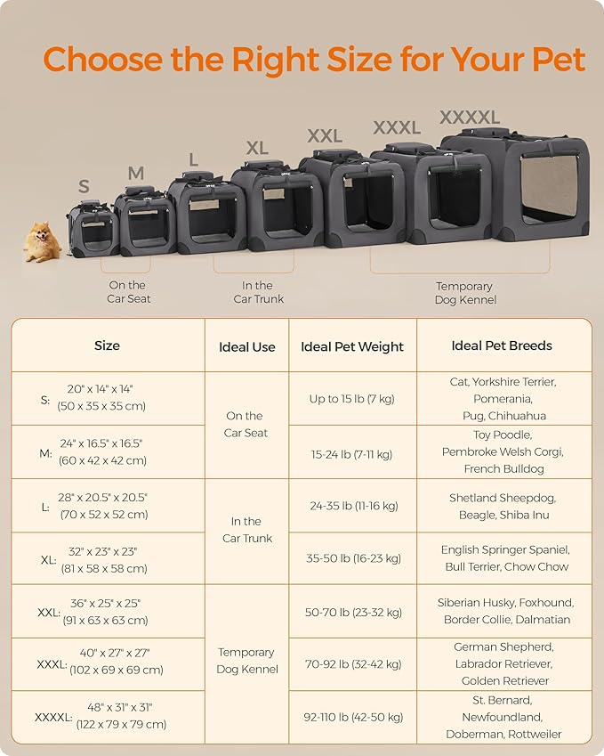 - _HOOSE THE RIGHT SIZE_his 28" x 20.5" x 20.5" collapsible dog carrier is ideal for pets between 24-35 lb. Please read our tips on the pictures to measure your pet and choose the right size