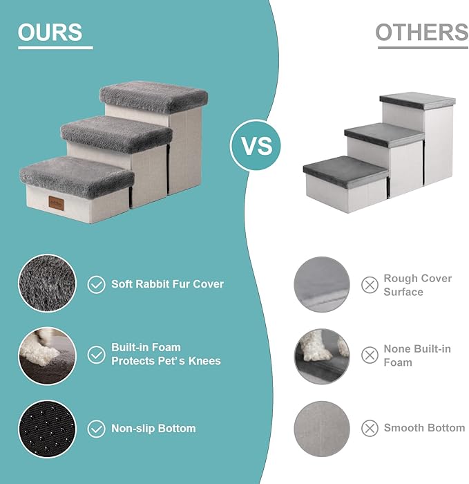 - 【Dog Stair with Storage】NOTE: The STAIR IS ONLY SMALL PET. Each step has a useful storage space, perfect for storing pet toys, clothes, snacks and any other pet supplies and accessories you can think of. Each step of the ladder is less than 5 inches, especially more suitable for puppies and pets with knee injuries. NOTE: Be sure to check first whether the SIZE of the dog stairs is suitable for your needs.