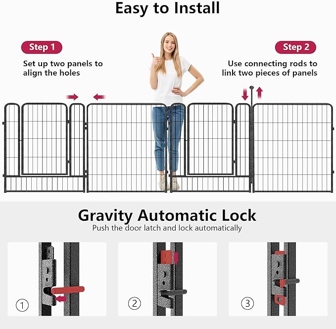 - 【Easy to Setup & Multipurpose Shapes】: The dog fence outdoor can be easily assemble in minutes by combining two dog fence panels and inserting an iron rod through the hole. You can customize the pet fence into any shapes you need according to your house, garden or yard, such as a DIY dog house indoors, garden fence for dogs, and more