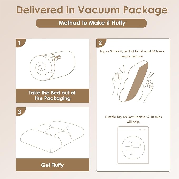 - MACHINE WASH and CARE INSTRUCTION - The washable dog bed can be put directly into the washing machine as a whole. This plush dog bed is vacuum-compressed, please remove the compression bag, shake it completely, and leave it for about 24 hours to expand. After washing and before use, please shake the bed back fluffy.