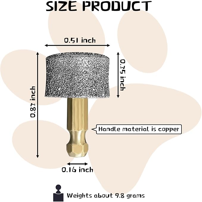 • 【Size】Featuring a 1/6 inch (4mm) copper hexagonal shaft handle, with a nail grinding head diameter of 0.51 inch and thickness of 0.59 inch, made with 80-grit diamond coating. Specifically designed for dog nail grooming.