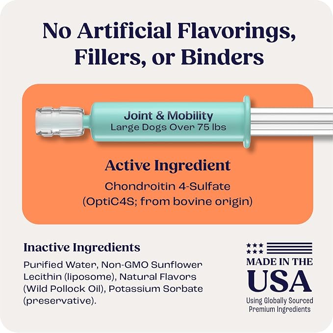 - EASY-FEED WEEKLY DOSES FOR MAXIMUM RESULTS: Our drug-free ingredients are safe for long-term use. Start your pet’s joint health journey with 2 boxes for the first month. Box #1: Administer 1 liquid dose every 4 days for 4 doses. Box #2: Maintain joint health with one dose per week.