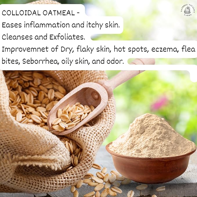 - Colloidal Oatmeal - Cleanses and exfoliates, helps with itchiness and dry flaky skin.
