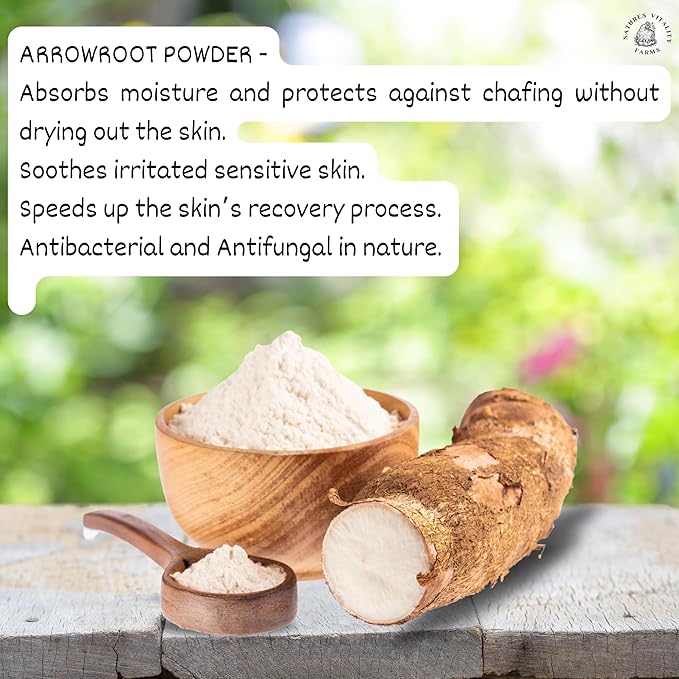 - Arrowroot Powder - Superior to corn starch as it soothes irritated skin, helps with oil control, and lastly it is light weight and super silky to the touch.