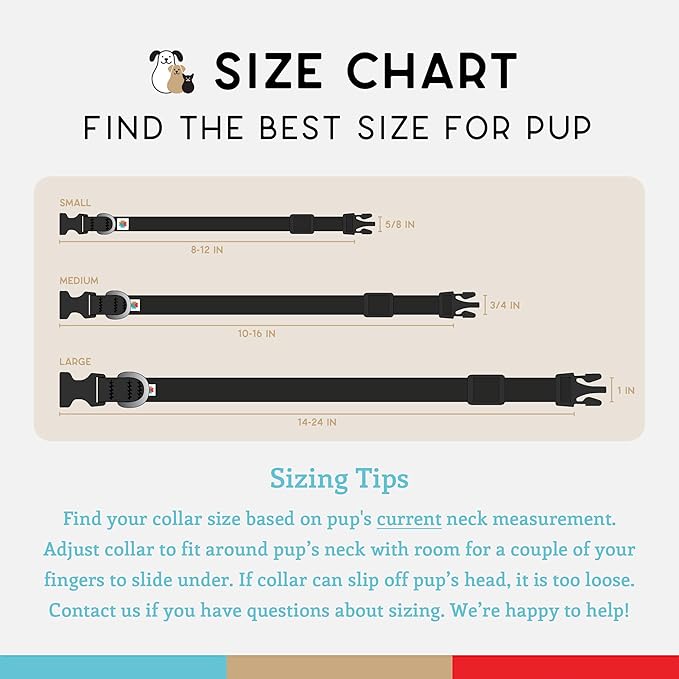 - Adjustable Fit: Each of our three available collar sizes offers an ample adjustable range for a comfortable fit for pup now and allowing some room and flexibility as your dog grows.