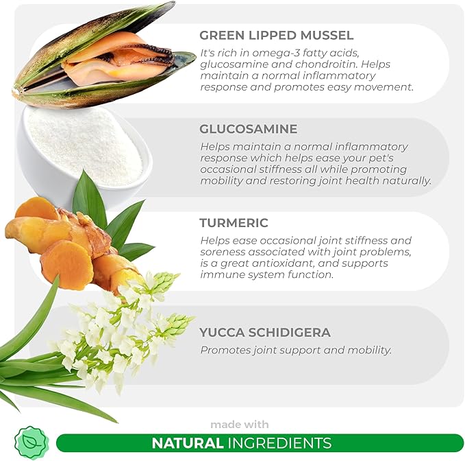- Advanced Joint Health Formula: Our hip and joint support product for dogs combines powerful ingredients like Glucosamine, Green Lipped Mussel, and Egg Shell Membrane to maintain a normal inflammatory response, reinvigorate joint health, and promote joint mobility naturally.