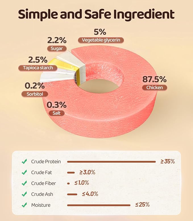 • 【Easy to Digest】The perfect combination of taste and nutrition! Made with premium-quality more than 87.5% chicken, these small pieces are packed with protein, low in fat, and easy to digest, making them an excellent choice for your pet's snacking needs. Our Chicken Sausages are easy to digest, making them gentle on your pet's stomach for worry-free snacking