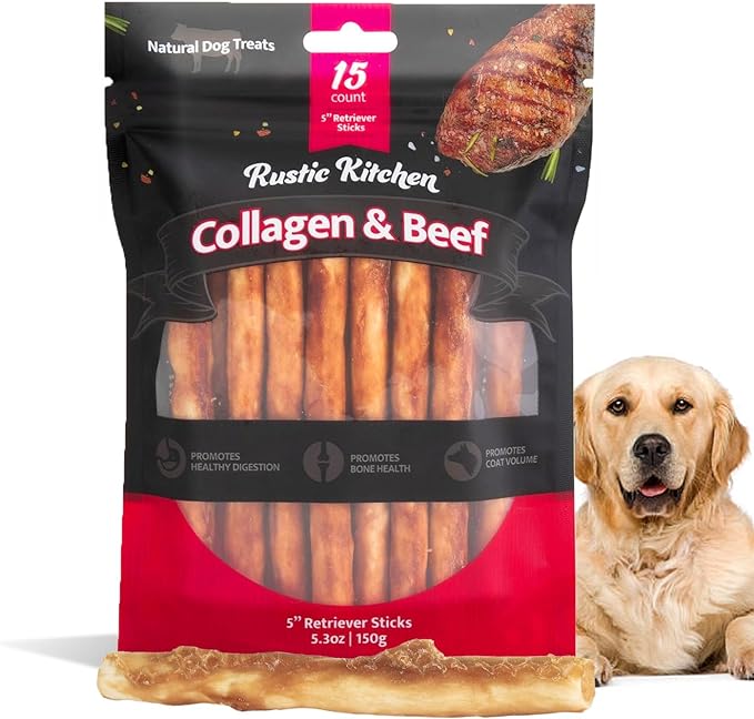 Real Beef Collagen Sticks for Dogs, Dog Chews Long Lasting, Rawhide Free - 15 Pack High Protein Chew Dog Treats for Small, Medium, and Large Dogs