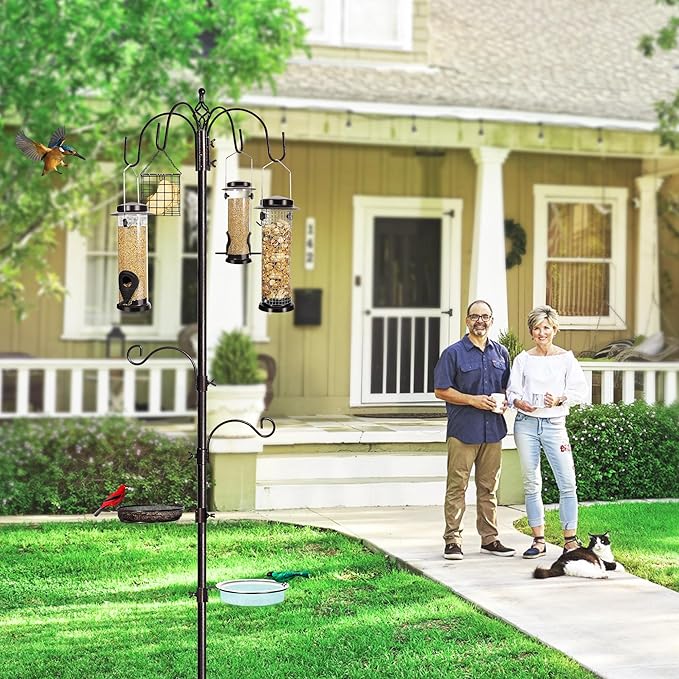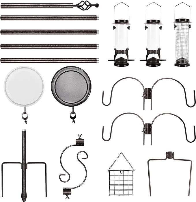 - Multifunction: Bird feeding pole comes with tube feeder for birds and melon seed feeder with tube, mesh tray, 4-large top hooks, suet feeder, 2-middle hooks, water bath bowl, and 5-prong anchor, to provide sufficient resting and feeding places for birds