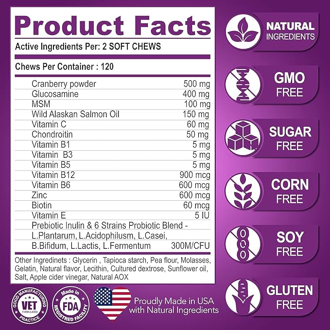 - 15-in-1 Dog Multivitamin: offers a unique and effective blend of dog supplements & vitamins, including 6 probiotics, Omega-3 rich salmon oil, glucosamine, promoting your pet's overall wellbeing