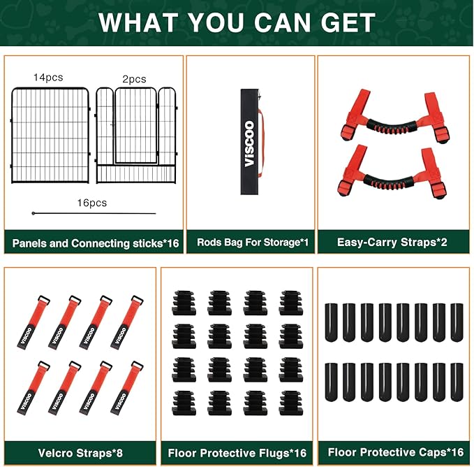 - 🐶 【Dog Playpen Outdoor Indoor】Our dog pens are made of rust resistant metal, which can extend their lifespan and make them more strong. The durable dog fence is suitable for indoor or outside use. You can wear a protective cap at the bottom of the fence and iron pole, which not only mutes the sound, but also effectively protects the floor from scratches.