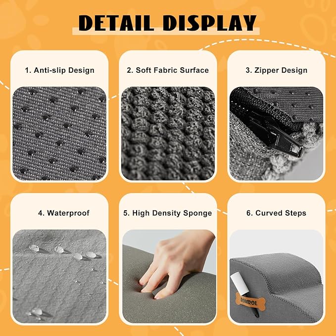 High Density Foam Dog Stairs Ramp for Beds Couches, Romrol Pet Steps with Durable Non-Slip Waterproof Fabric Cover, Dog Slope Stairs Friendly to Small Dogs and Cats or Pets Joints, 2-Tiers