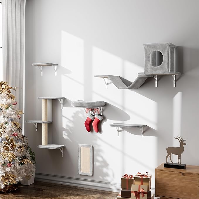 NUNU LAB Wall Mounted Cat Climber Set, 6 Pcs Cat Furniture Set with House, Bridge, Steps, Scratcher Board and Hammock, Shelves for Indoor, Luxury Walls Furniture(Gray)