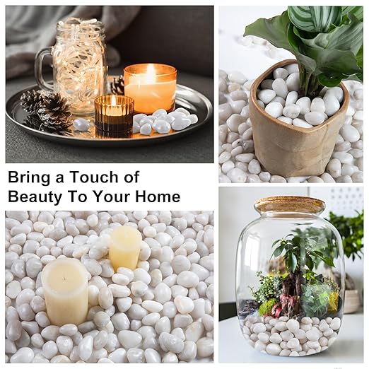 - MULTIPLE USES: It is most commonly to use our white polished pebbles as a decorative addition to ay size potted plants, aquarium, vases, terrariums, bonsai, succulent planter, candle holder etc and our rocks are popular in weddings, floral arrangement and seasonal decorations. Rocks will give the arrangement a natural,earthy feel. Natural river rock are perfect for outdoor landscaping, add beauty to your garden, patio, fountain, walkways, turn your backyard into a beautiful resort look.