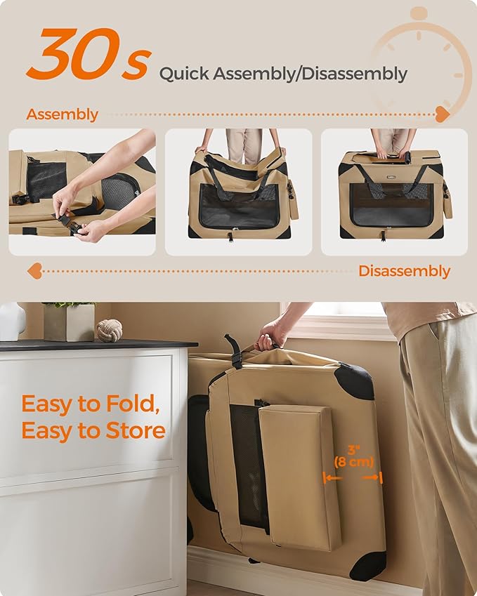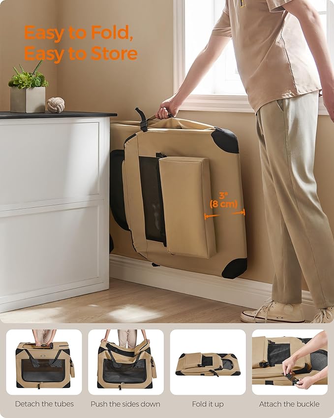 Feandrea 36 Inches Collapsible Soft Dog Crate, Portable Travel Dog Crate for Indoor and Outdoor Use, Dog Carrier Kennel with Safety Zippers, for Living Room, Car, Travelling,Camel Brown UPDC090K01