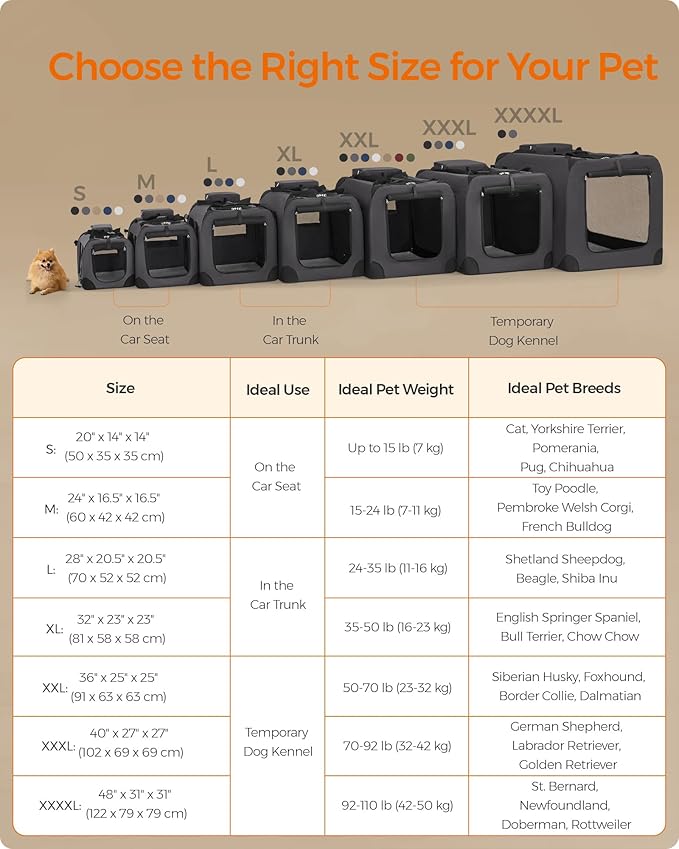 - _HOOSE THE RIGHT SIZE_his 36" x 25" x 25" collapsible dog carrier is ideal for pets between 50-70 lb. Please read our tips on the pictures to measure your pet and choose the right size