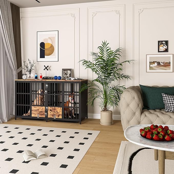 - Double Dog Crate Furniture - The classic rustic vintage style of this extra large dog crate seamlessly blends with your home decor, adding a touch of elegance to any room. The spacious top surface can be used as an end table, providing space for TV stand, potted plants, lamps, photo frames, and other home decor items.