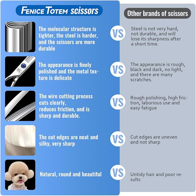 - Features: This pet scissors are available in 7 inches with ergonomic handles, suitable for most people. Finely polished, frosted surface, fine metal texture. precise adjustable screws effectively prevents screws from loosening due to prolonged use