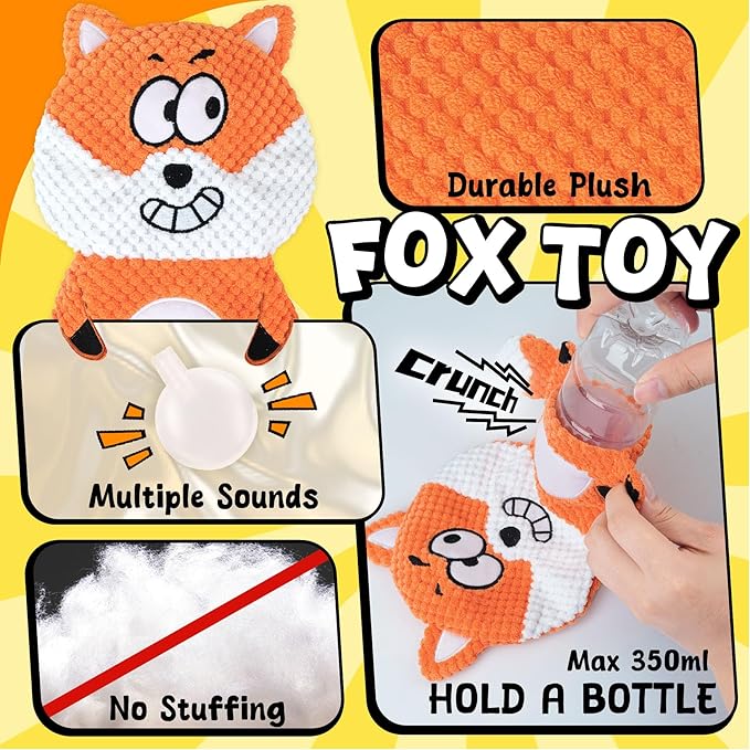 - Cute Design & More Fun: There are a newly designed fox toy has squeaker and crinkle paper, but also you can place a bottle in to make a fun crunch (Max 350 ml). Also, the treat ball can improve puppy's intellect by learning how to get treats fall out