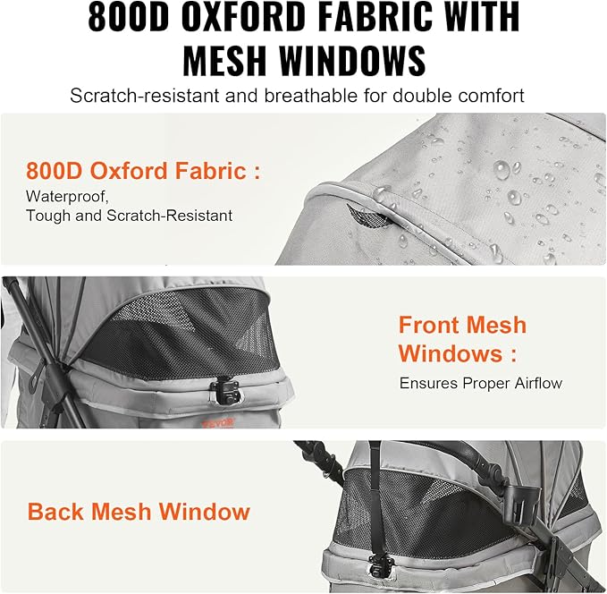 - DURABLE & STURDY MATERIAL: The structure of VEVOR pet stroller is made of superior aluminum alloy with rust-resistant powder coating, which is more durable and sturdy than normal steel frame. And this dog stroller is equipped with sturdy and water-resistant IMPROVED 800D oxford material, can withstand pet nibbling and keeping the cat stroller in pristine condition.