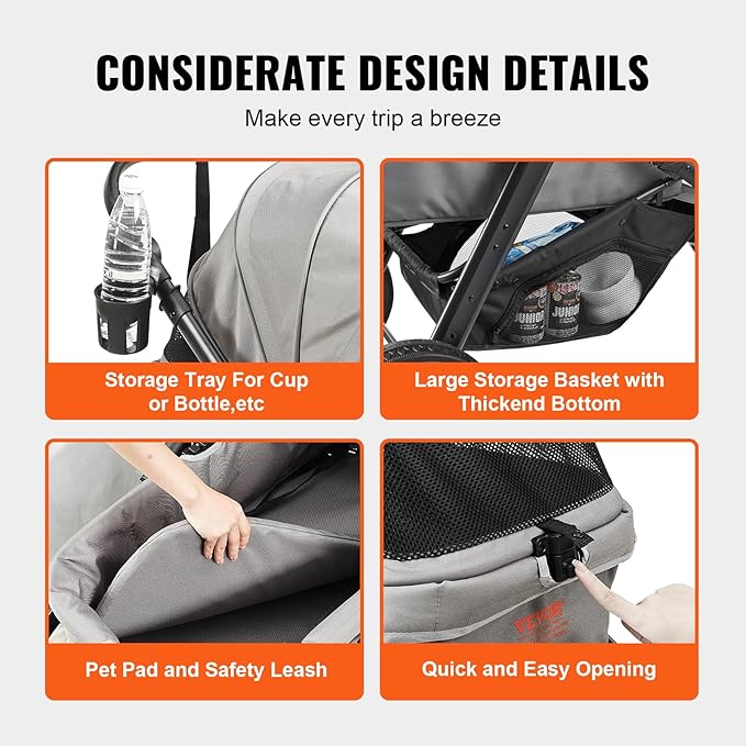 - CONVENIENT STORAGE DESIGN: This dog stroller designed a spacious storage basket with thickened bottom for better load bearing to store purse,toys, treats, and water bottles, etc. The extra cup holder on the handle is good to put bottle or cup.
