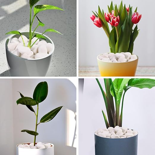 - ROUND AND SMOOTH: Our polished snow white pebbles for plants are tumbled to produce the smooth and round rock for all creative interior and exterior designs. No sharp edges, ready to get on your feet. River rocks are gift from nature, so they are in different shapes such as oval, round etc. Due to their shape, these pebbles are perfect for bottom of planters for drainage to help soil retain moisture. At the same time, the river rocks make planters have a pop of elegance.