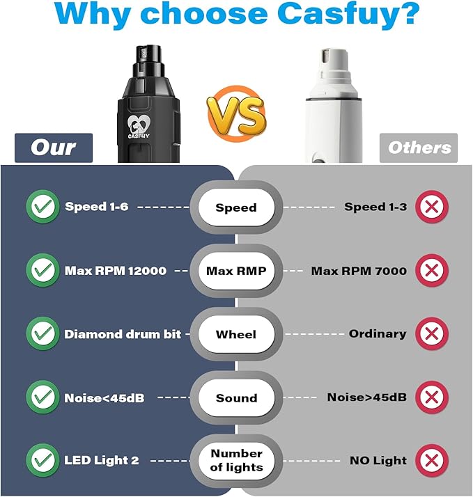- Newest enhanced power & 6 precisely controlled speeds: 7000RPM to 12000 RPM power makes Casfuy dog nail grinder one of the most powerful grinders on the market. It is also the safe power to grind at home. Multiple speeds and ample power meet small, medium, and large pets' nail trimming needs.