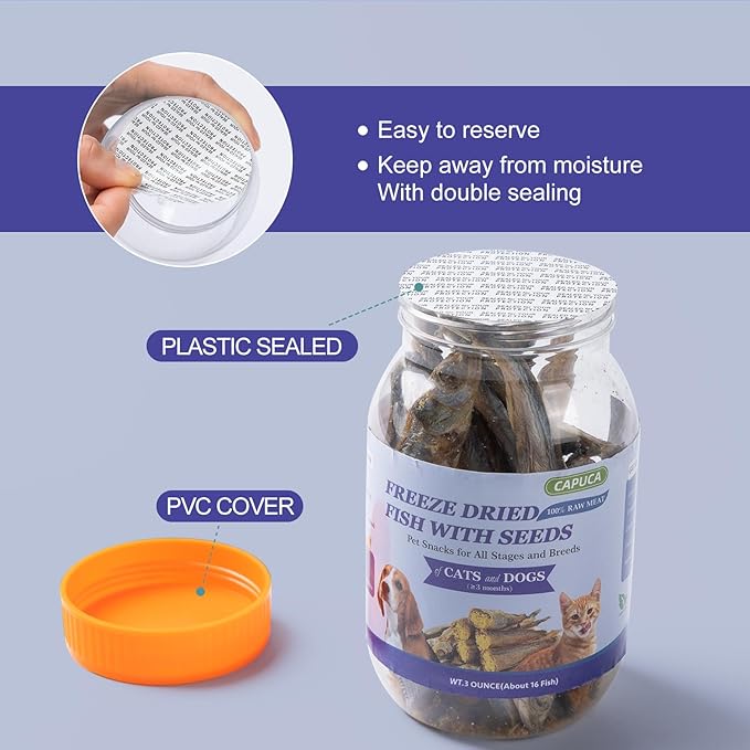 - Pure Natural: Made by 100 % premium freeze dried capelins; The freeze-drying process removes moisture from the capelins, it's free of any corn and soy; Each bottle contains approximately 16 Fish