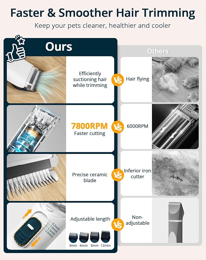- Precision Ceramic Blades: Equipped with ceramic blades, our pet hair vacuum ensures sharpness and durability, providing a superior cutting experience compared to plastic or steel blades. The trimmer motor operates at 7800RPM, facilitating quick and efficient grooming without hair clogging.