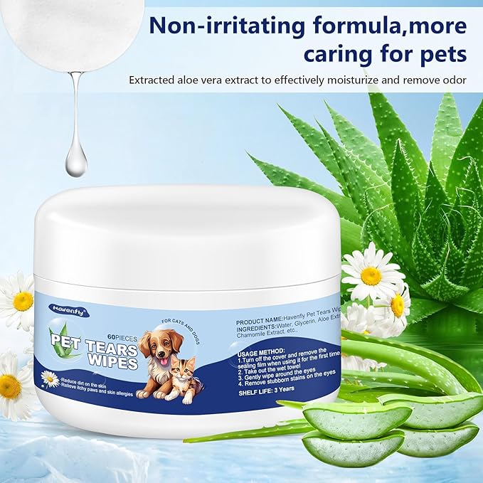 • Dog Eye Wipes Tear Stain Remover: Size: 60pcs, 2 inches in diameter. Designed for pet eye cleaning, it effectively and quickly removes dry mucus secretions, discharges, and crusts. Long-term can improve and prevent tear marks and reduce the risk of eye irritation