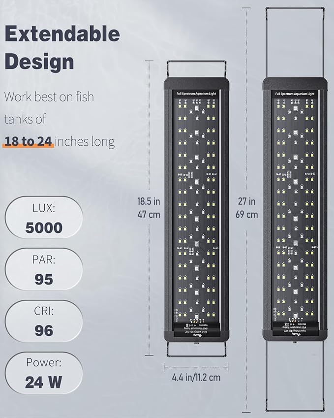 - For 18" to 24" Tanks: With an extendable bracket (min length: up to 18.5"; max length: up to 27"), the LED aquarium light always stays steady on the fish tank. Work best on tanks of 18 to 24 inches long.