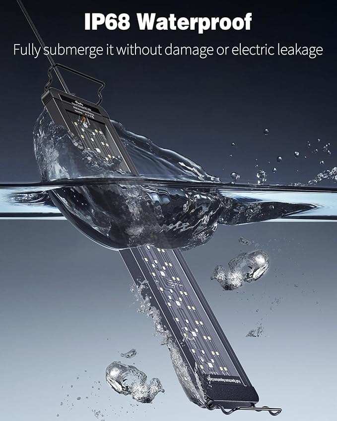 - D/N Mode: Customize the daytime and night working hours with the IP68 waterproof fish tank light. Daytime duration: 6 h, 8 h and 10 h; Night duration: 2 h, 3 h and 4 h. Simulate the daylight and moonlight to create a natural environment.