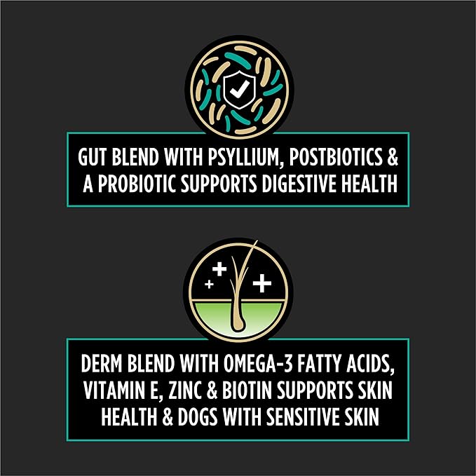 • Dog food supplements, made with a gut blend containing psyllium, postbiotics, and a probiotic to support digestive health