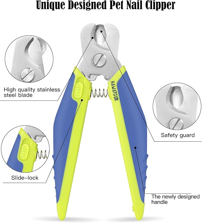 - New Design Look: Hawatour pet nail clipper adopts a new design shape, which is more powerful, labor-saving, comfortable and more beautiful in appearance. The handles are also coated with non-slip rubber makes a super-tight and tiring holding grip not necessary
