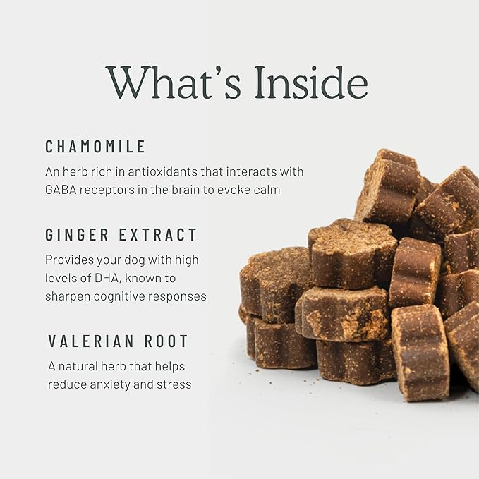 - Dogs Deserve Real Ingredients: We rely on real active and inactive ingredients you can pronounce like Valerian Root for calming, Chamomile for antioxidant support, and Omega-3 Algae for sharpened cognition. No fillers or additives - just the premium wellness your dog deserves