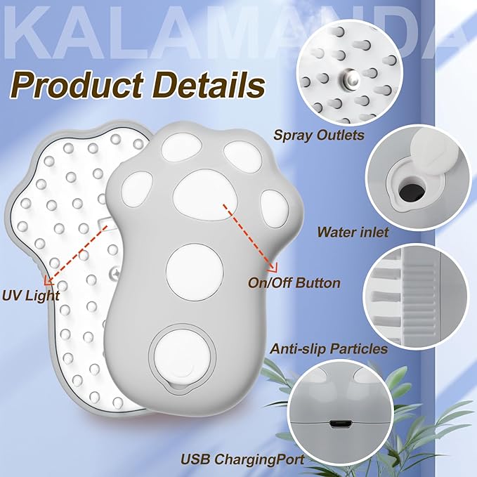 Cat Steam Brush for Shedding, 4 in 1 Steamy Cat Brush with Cleanser, Dog Massage Grooming Brush with Release Button, Pet Hair Cleaning Misting Comb for Kitten(Grey Paw)