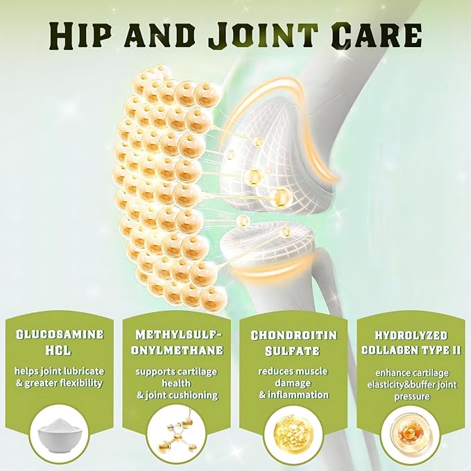 - Bone Health and Super Absorption: Our glucosamine chondroitin for dogs is rich in lactoferrin, magnesium and calcium, they has been proven to increase bone density and build bone structure, avoid reduced mobility and frequent fractures. In hip and joint supplement for dogs, adding magnesium and vitamin D directs calcium to where it should go—BONES, which means they improve calcium absorption and bioavailability. Vitamin C can help the synthesis of collagen and provide nutrition to the cartilage.