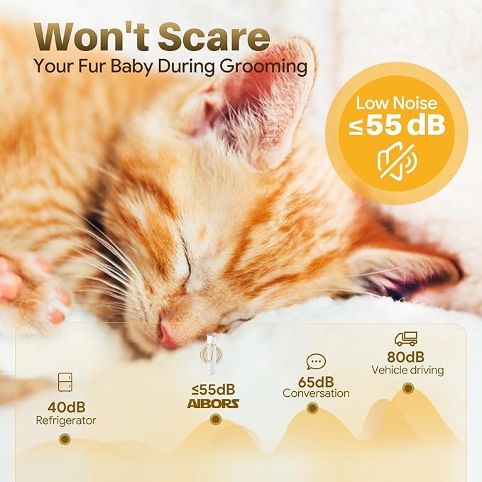 - Quiet Dog Hair Clippers: The pet grooming trimmer are equipped with advanced motors and silent technology, with fast speed and low vibration. The noise is about 55db when trimming, ensuring that your pet is comfortable throughout the grooming process and will not scare your furry baby. Their hair can be trimmed to the right length with steel scissors and combs, and then the electric trimmer can be used for body trimming to avoid pulling