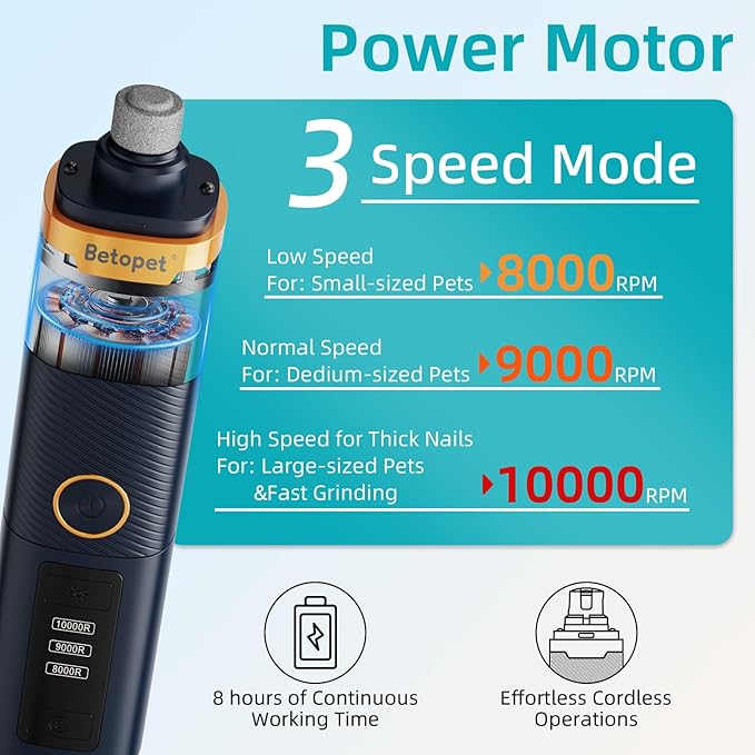 - 【3 Speeds and 3 Grinding Ports】 - Equipped with two adjustable speeds and three grinding ports, the BETOPET pet nail grinder for dogs adapts to different nail hardness and pet sizes. The low-speed option is perfect for small pets, while the high-speed setting effectively trims larger and thicker nails.