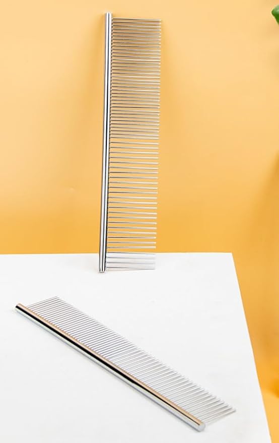 - DETAILED DESIGN: These dog combs have two different densities of wire teeth. Wide teeth can be used for combing knotted fur, while close teeth are ideal for brushing soft hair around the eyes, ears and fine hair on the legs. Please comb the fur lightly.