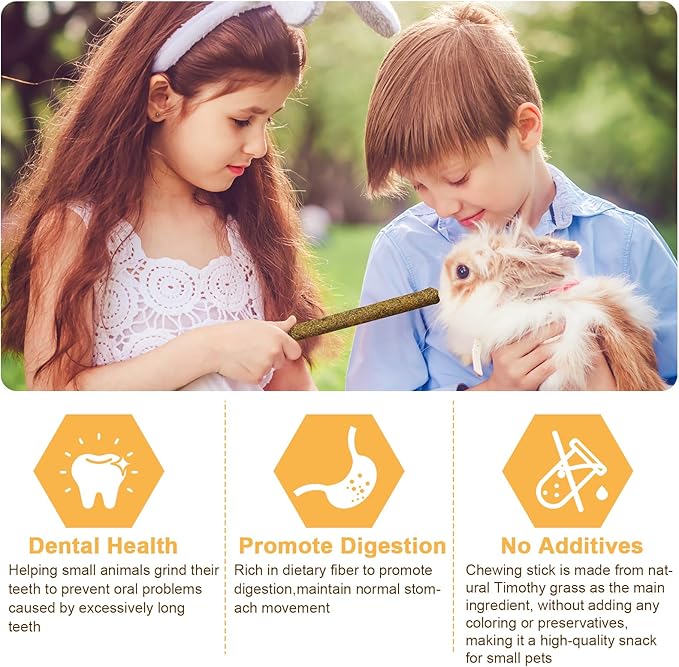 - 🐹【RICH NUTRITIOUS】Timothy hay sticks are rich in high fiber, low protein, and multiple vitamins, which can help pets in cages promote gastrointestinal peristalsis, efficiently aid digestion, relieve tension, improve appetite, and ensure the healthy growth, entertainment, and exercise of pets.