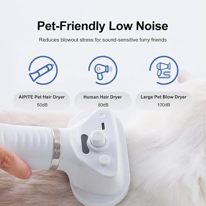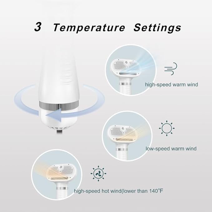 - 3 Temperature Settings: high-speed warm air, low-speed warm air, high-speed hot air. Different levels are designed for various application, high speed with low temperature can help dry your pets quickly, saving energy and suitable to prevent pain and burn. AiPITE pet grooming brush is specifically designed for small medium dogs and cats, friendly for pets scared of the blower.