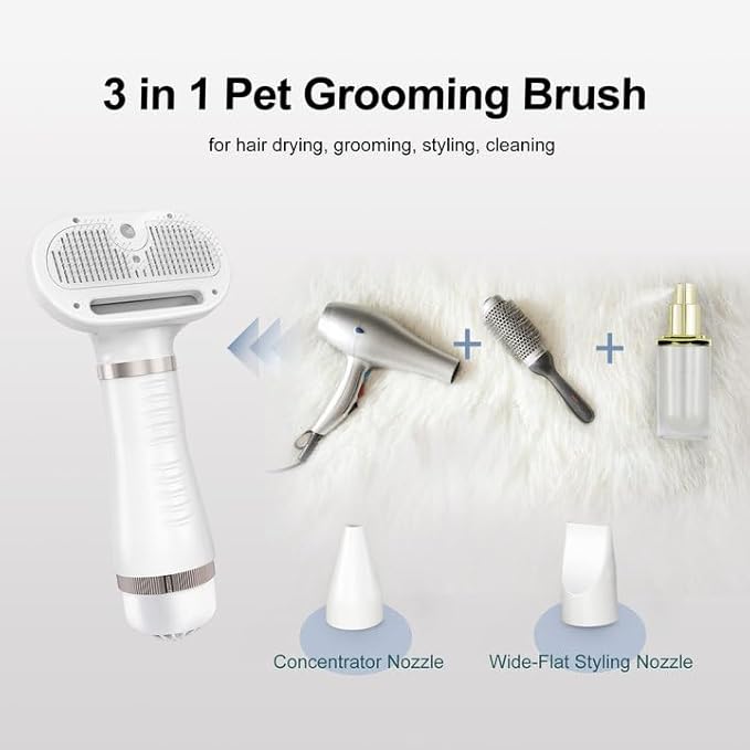 - 3 in 1 Grooming Brush: Steam + Blow Dryer + Brush, it isn’t just a regular grooming tool anymore. The innovative spray function allows you to add water or softener. The resulting steam gently removes loose fur, tangles, and any lingering sassiness.
