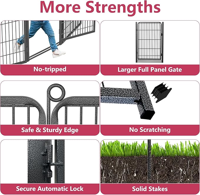 - 【Heavy-duty Metal Construction】- Dog playpen outdoor are made of high quality wrought iron, sturdy, firm and not easy to rust and the double anti-rust coatings helps the outdoor dog fence works well indoor and outdoor for long time. Protective pads on the bottom avoid slipping and scratching of the floor. Great dog pens outside for indoor outdoor use